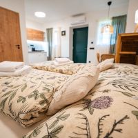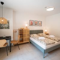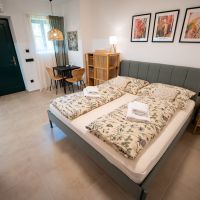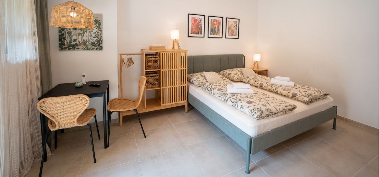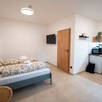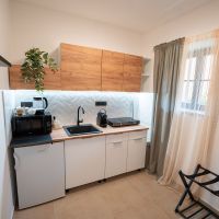 Apartmán číslo jedna je vhodný pro 2 osoby. Pokoj nabízí dvoulůžko a je vybaven kuchyňským koutem s dřezem, varnou deskou, rychlovarnou konvicí a mikrovlnnou troubou. Kuchyně obsahuje vše potřebné pro pohodlné vaření. Apartmán dále disponuje klimatizací, podlahovým vytápěním, televizí a Wi-Fi. Součástí je také vlastní koupelna se sprchovým koutem, WC, umyvadlem a fénem.