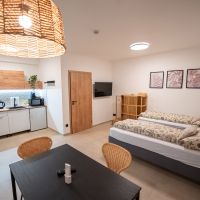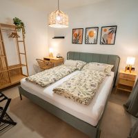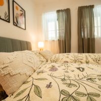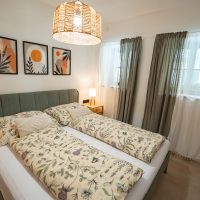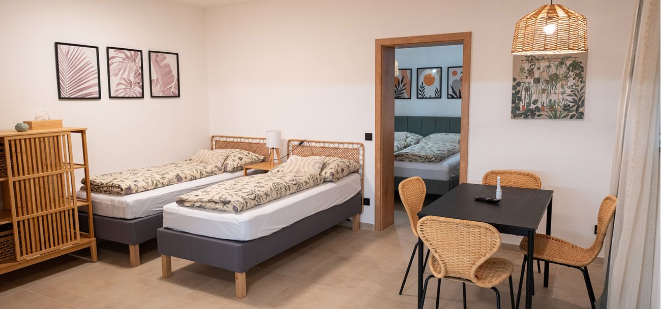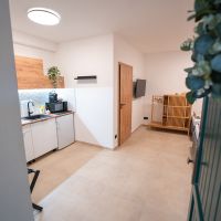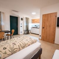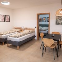 Apartmán číslo dva je vhodný pro 4 osoby. Dva pokoje nabízí jeno dvojlůžko a dvě samostatné postele. Apartmán je dále vybaven kuchyňským koutem s dřezem, varnou deskou, rychlovarnou konvicí a mikrovlnnou troubou. Kuchyně obsahuje vše potřebné pro pohodlné vaření. Apartmán dále disponuje klimatizací, televizí a Wi-Fi. Součástí je také vlastní koupelna se sprchovým koutem, WC, umyvadlem a fénem.