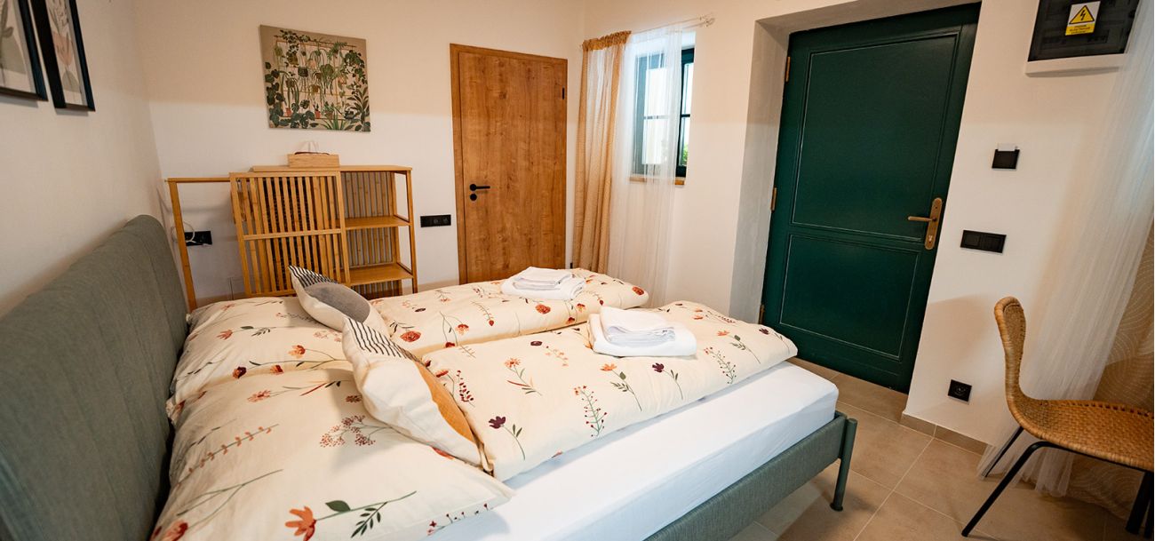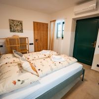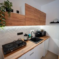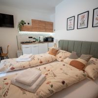 Apartmán číslo tři je vhodný pro 2 osoby. Pokoj nabízí dvojlůžko a je vybaven kuchyňským koutem s dřezem, varnou deskou, rychlovarnou konvicí a mikrovlnnou troubou. Kuchyně obsahuje vše potřebné pro pohodlné vaření. Apartmán dále disponuje klimatizací, televizí a Wi-Fi. Součástí je také vlastní koupelna se sprchovým koutem, WC, umyvadlem a fénem.